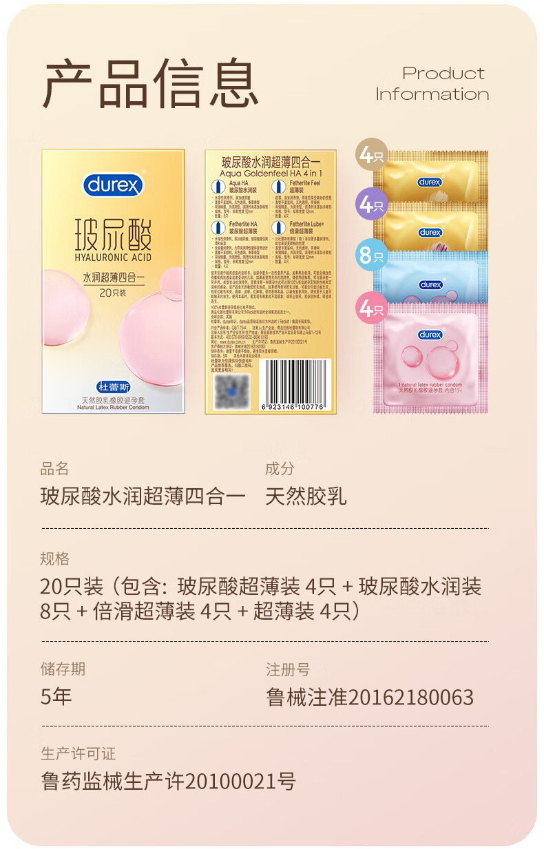 杜蕾斯(durex)水润超薄四合一避孕套隐形玻尿酸情趣001003安全套套男女计生用品 四种快感【20只】水润超薄四合一20