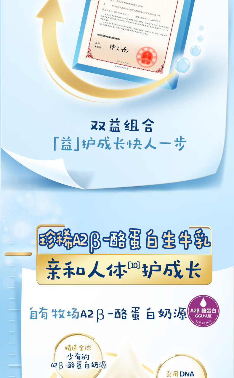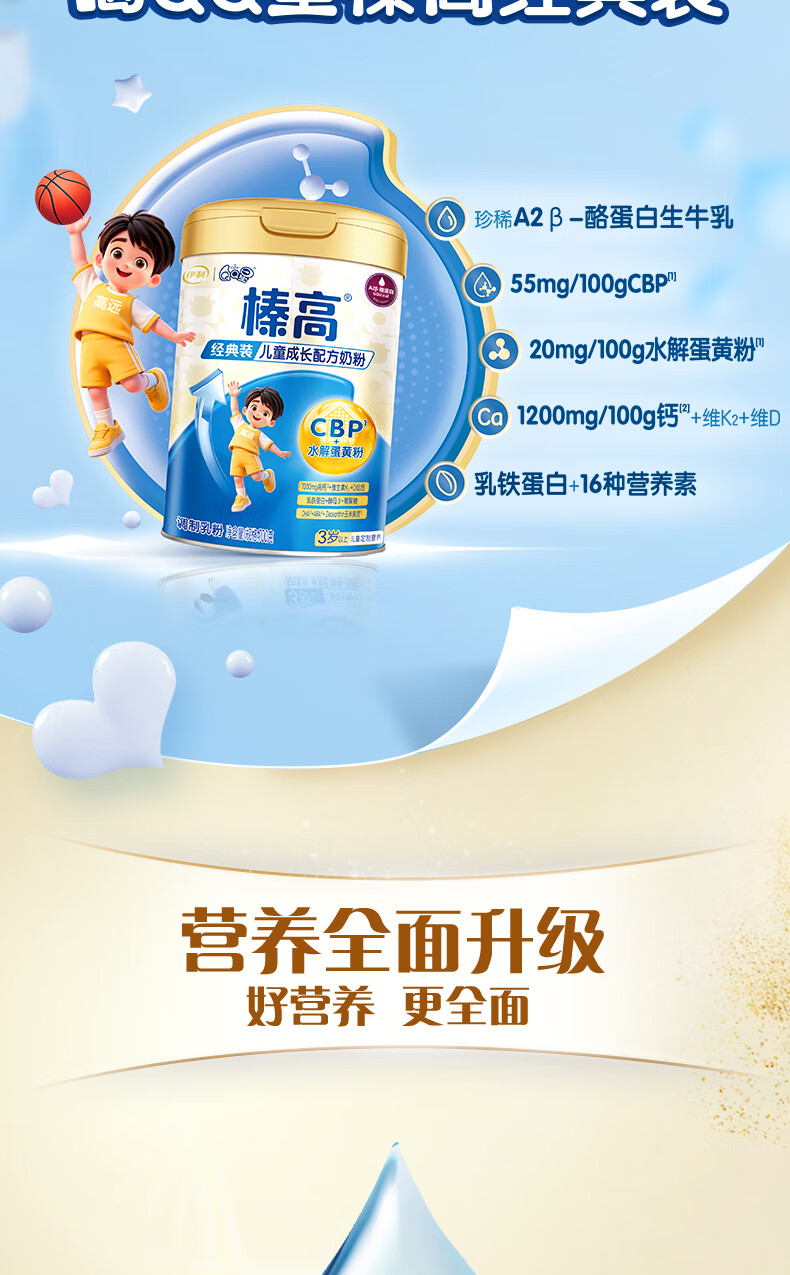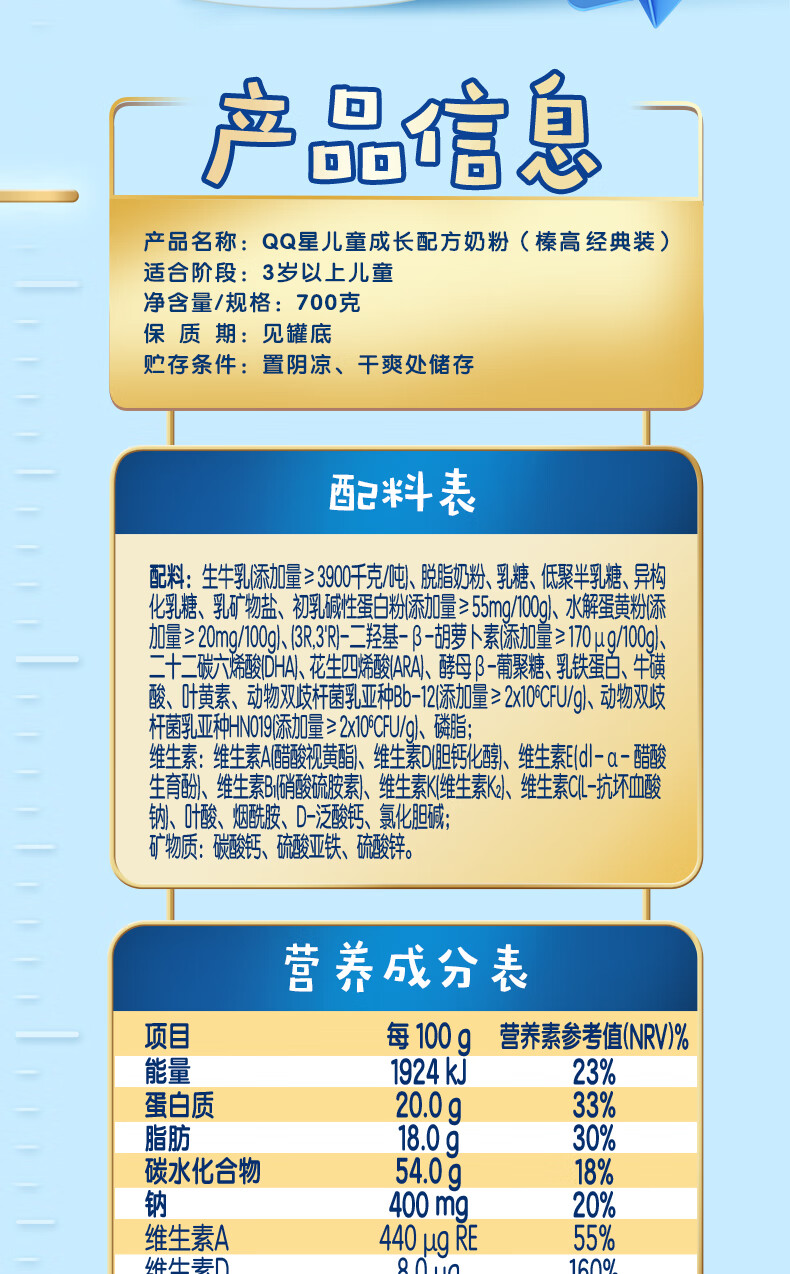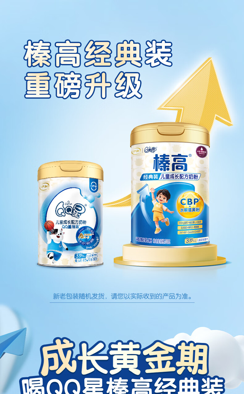 伊利QQ星榛高儿童成长奶粉4段3岁+A2β-酪蛋白奶源DHA乳铁蛋白700g