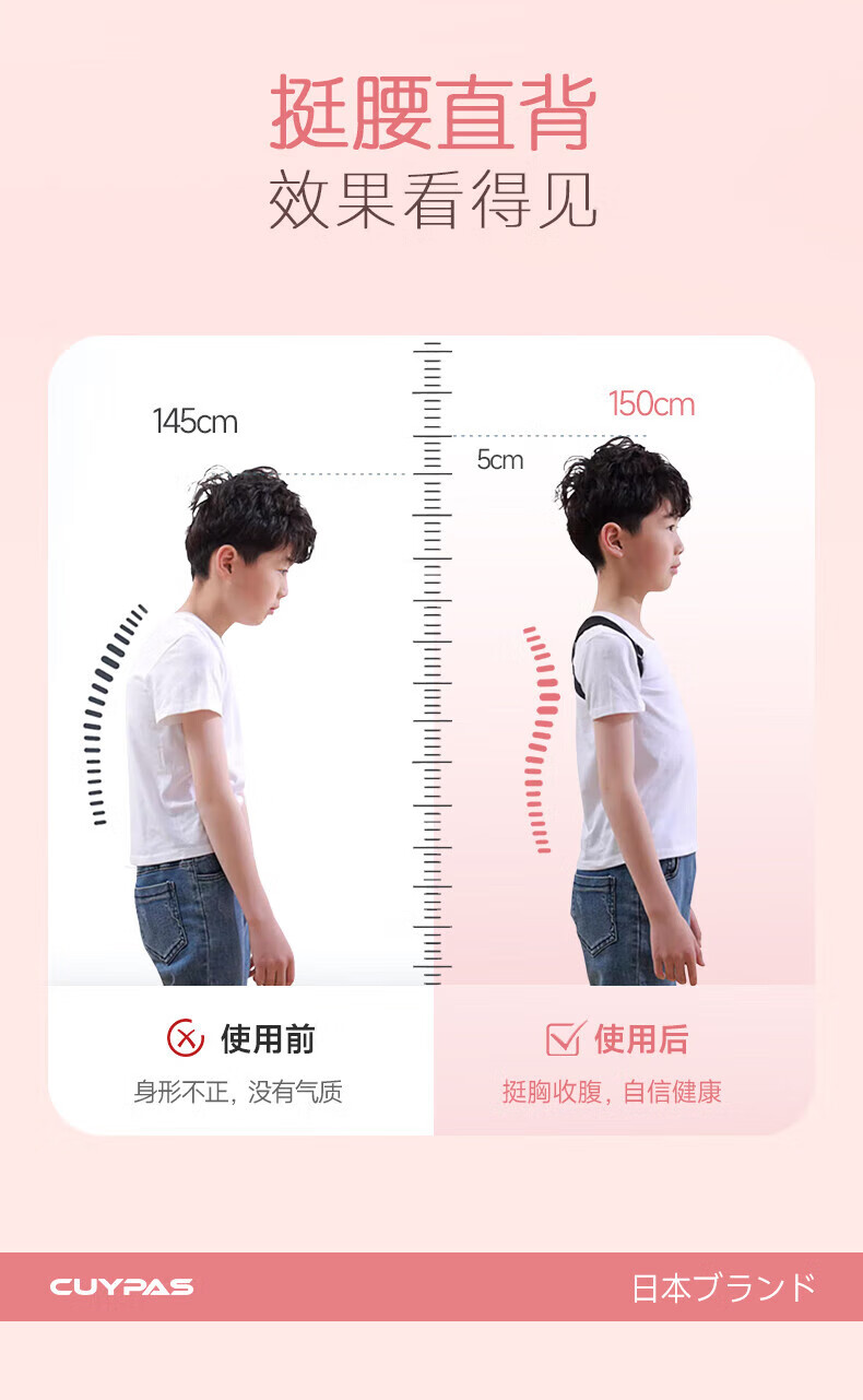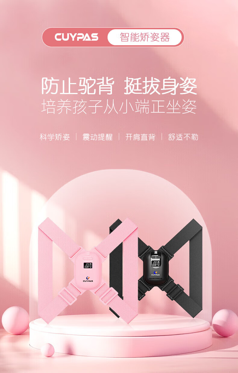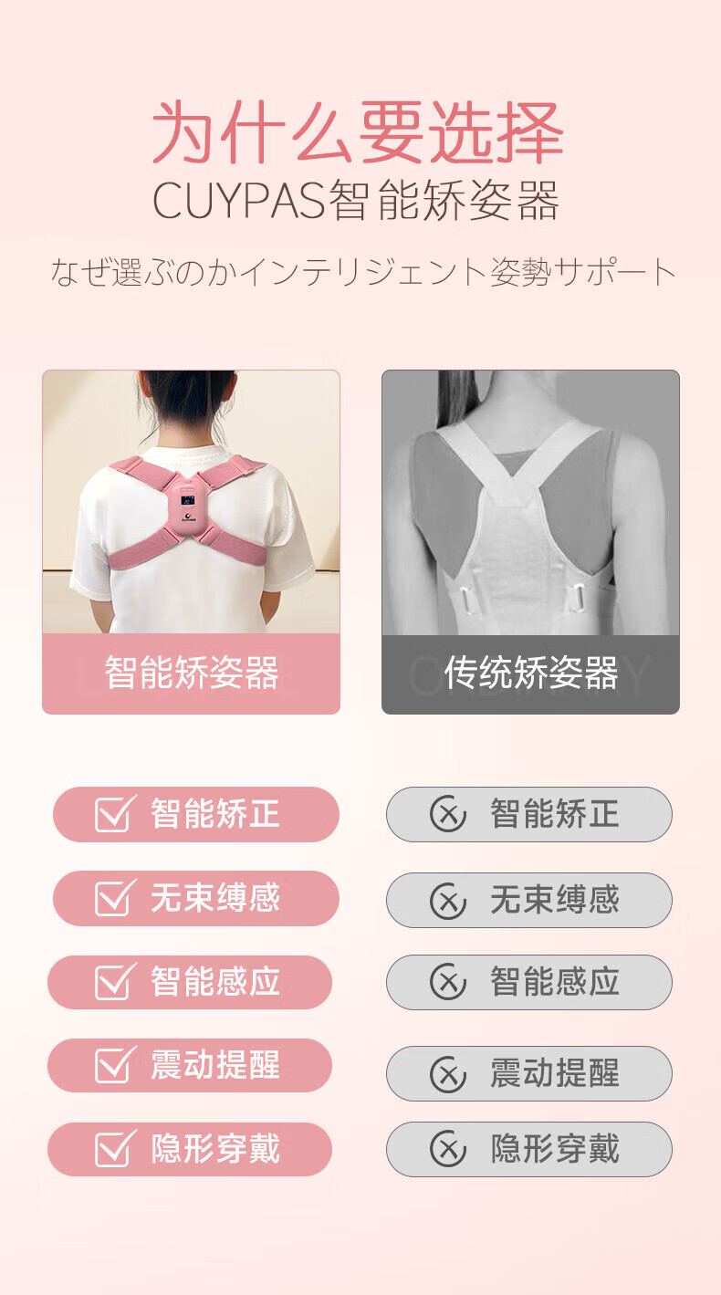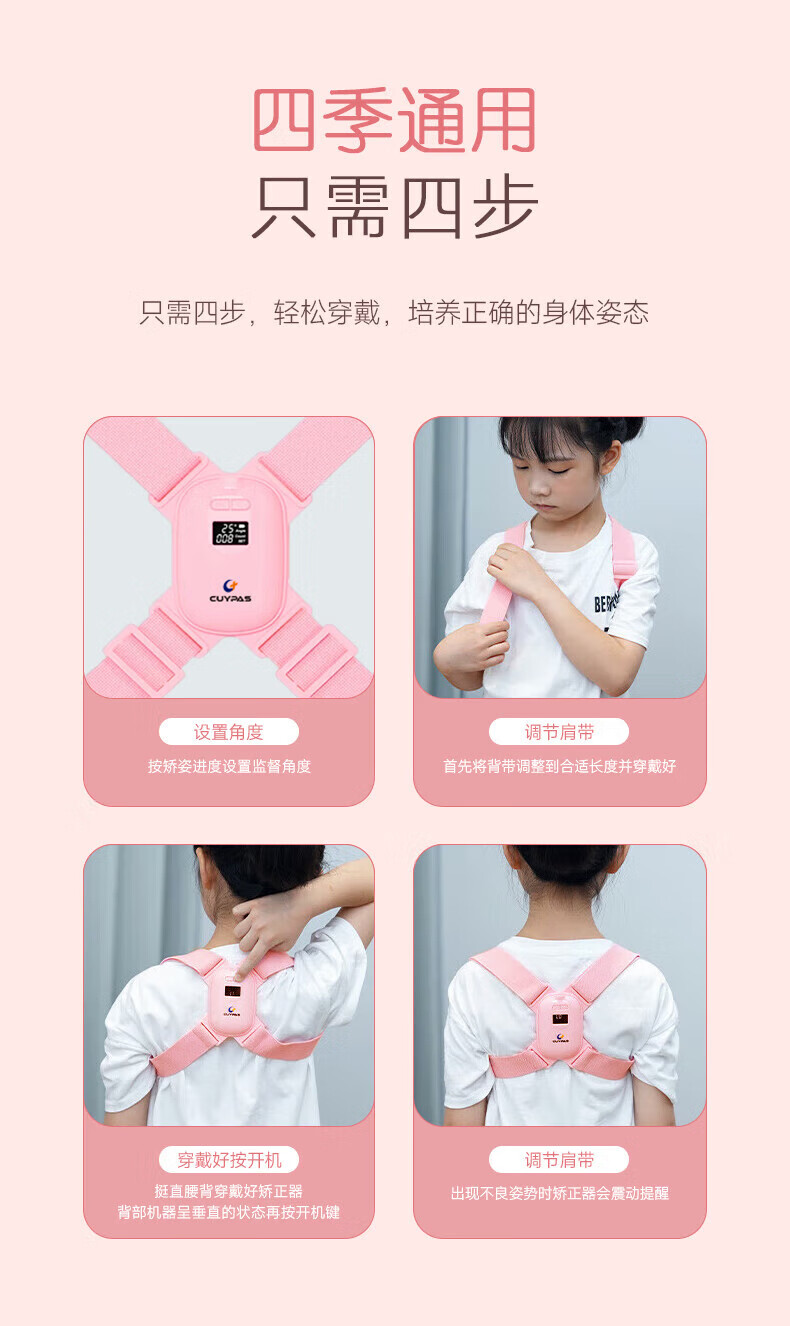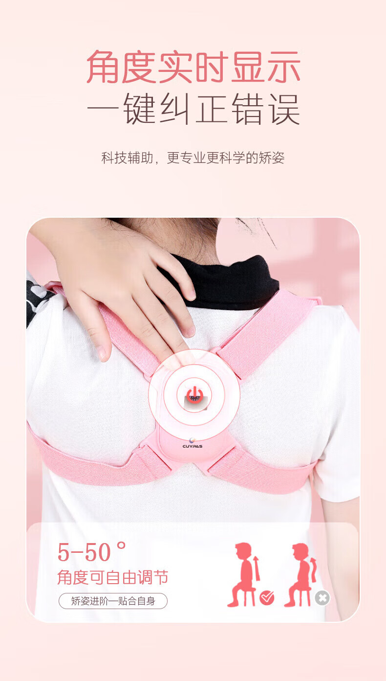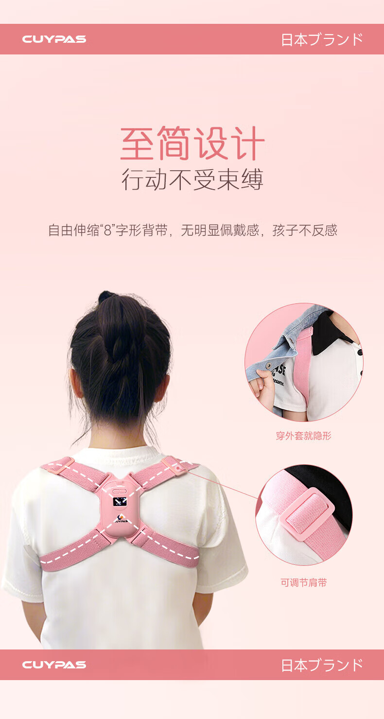 CUYPAS日本品牌智能提醒驼背矫正器隐形儿童学生青少年纠正坐姿矫姿带 粉色