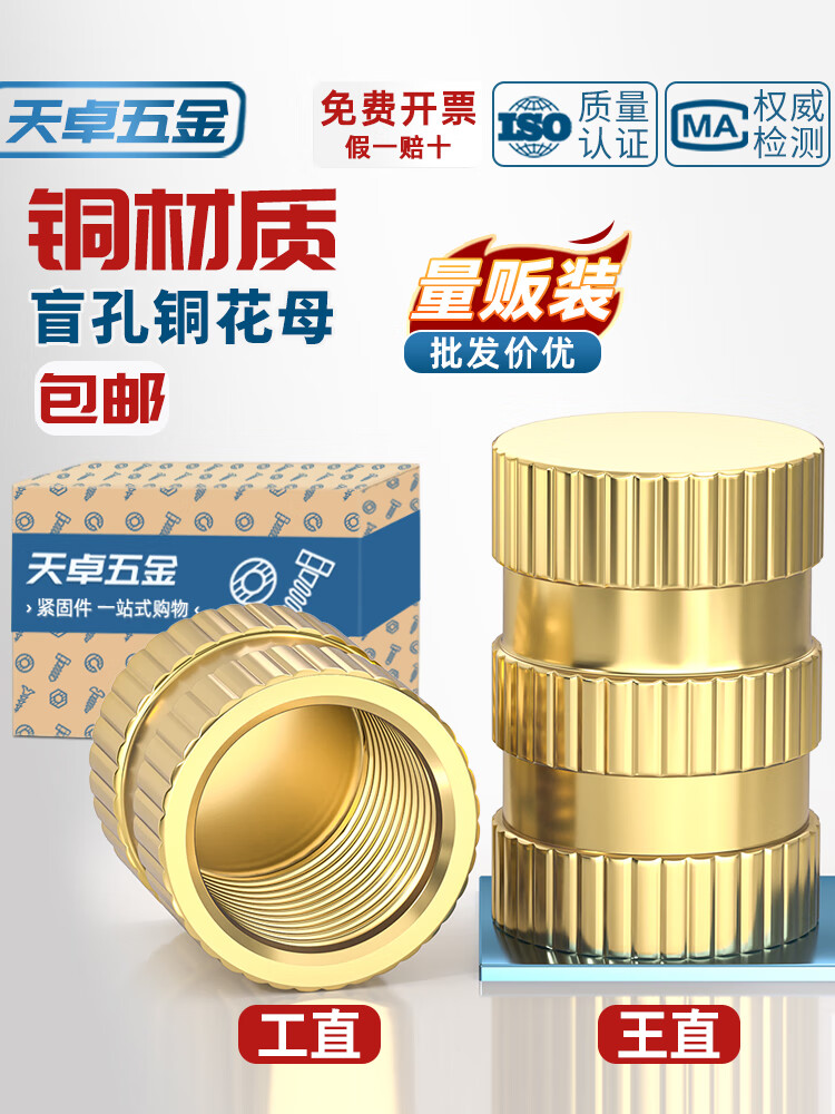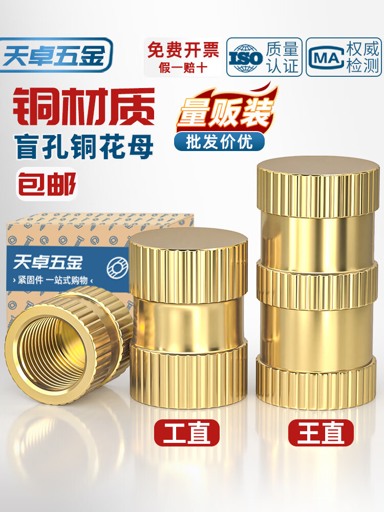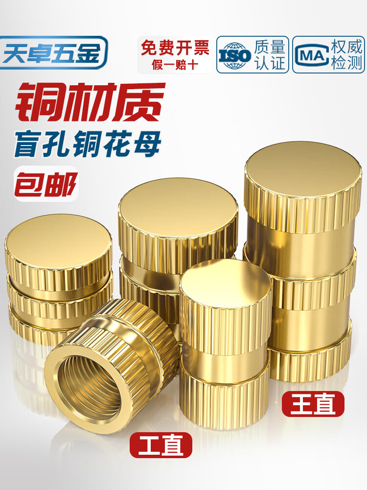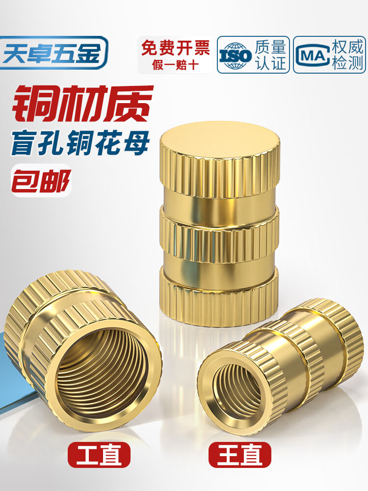 天卓五金盲孔注塑热熔铜螺母滚花螺母铜镶件预埋螺帽铜花螺母M2M3M4M5M6M8 M2.5*5*3.5【工直】-150个