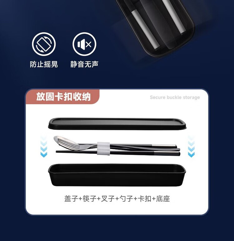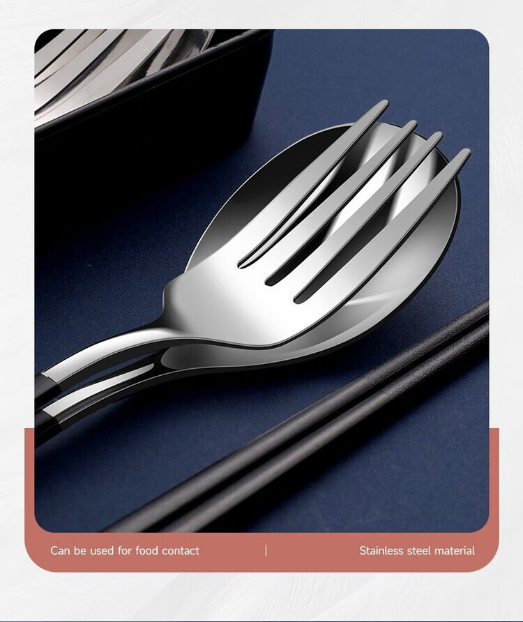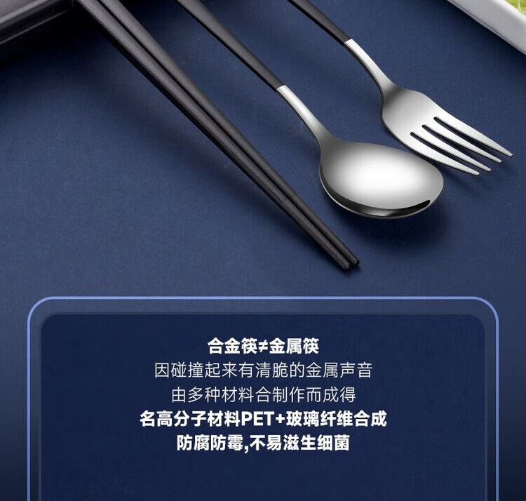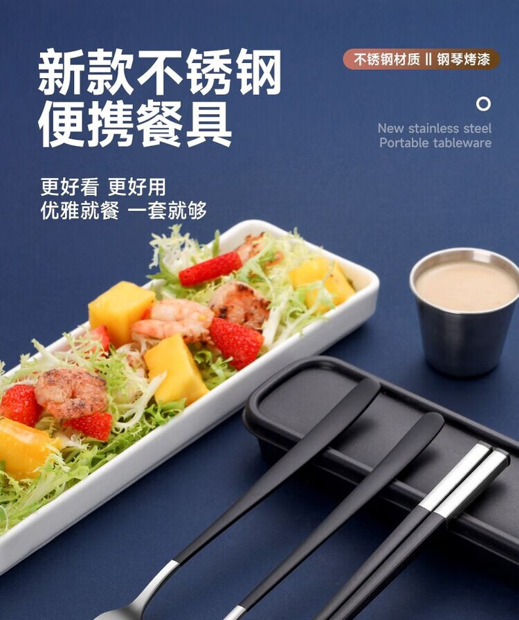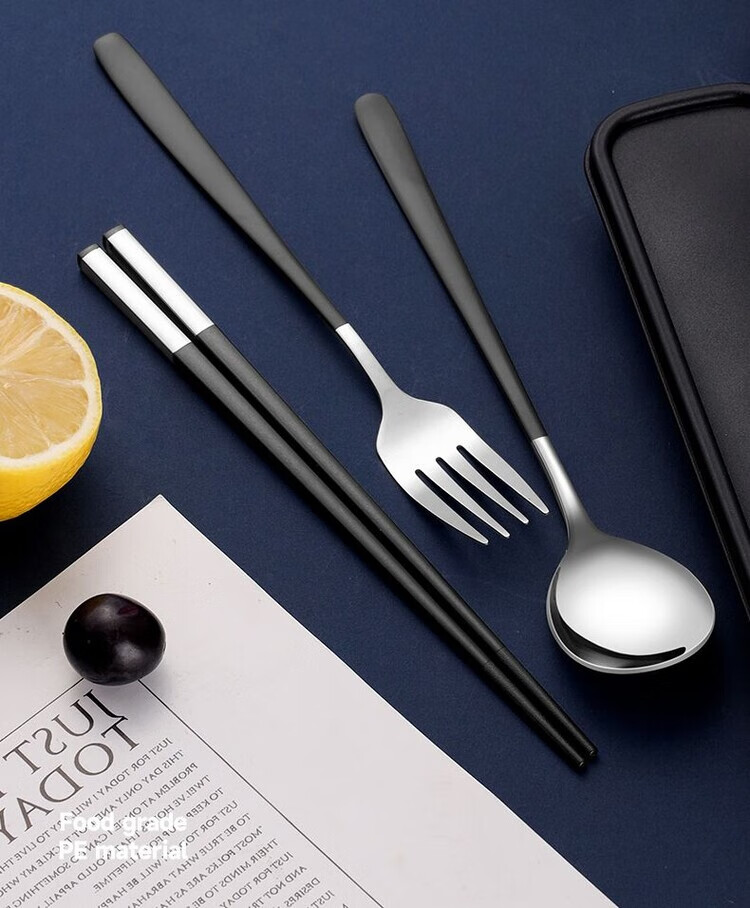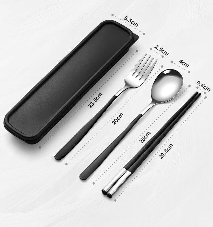 泰禧阁不锈钢学生餐具套装筷子勺子叉子便携三件套上班族成人餐具旅行装 黑色便捷筷子+勺子+盒子 暗黑色系