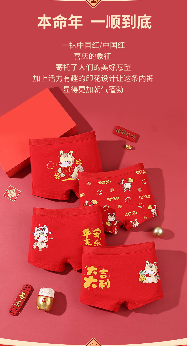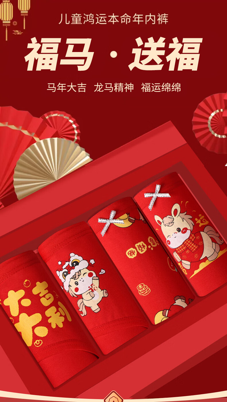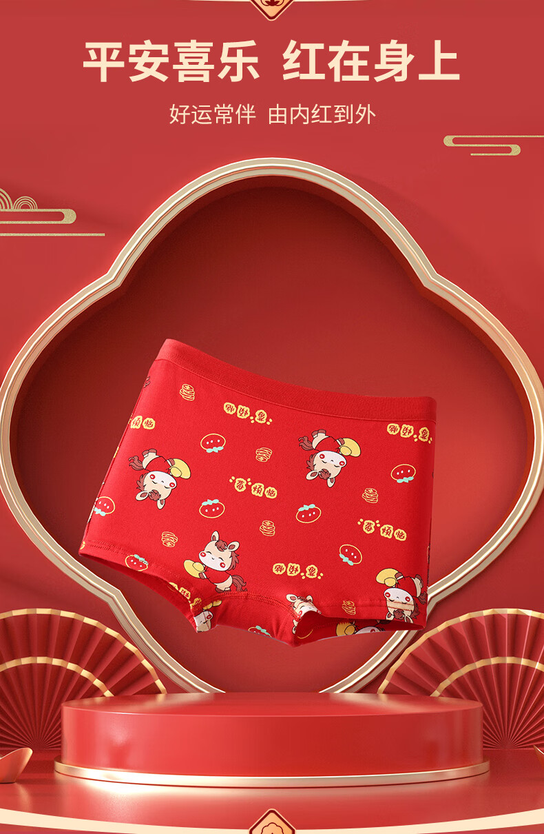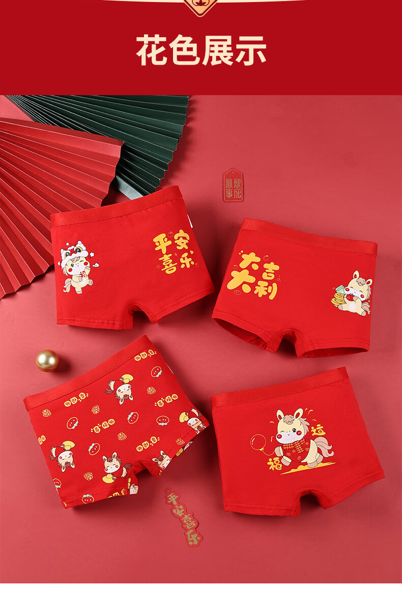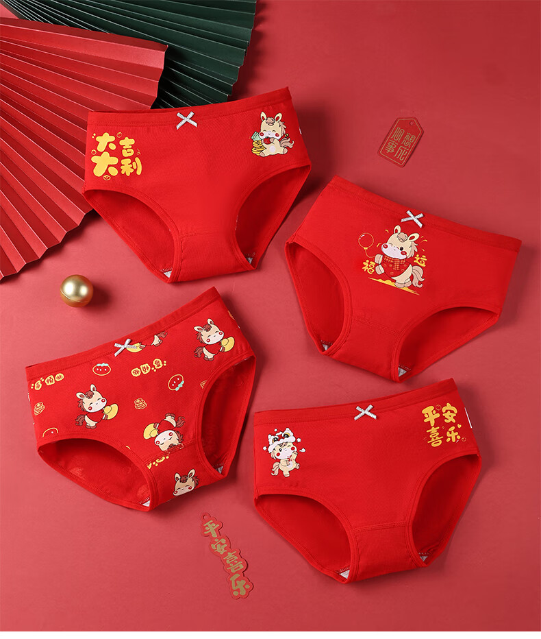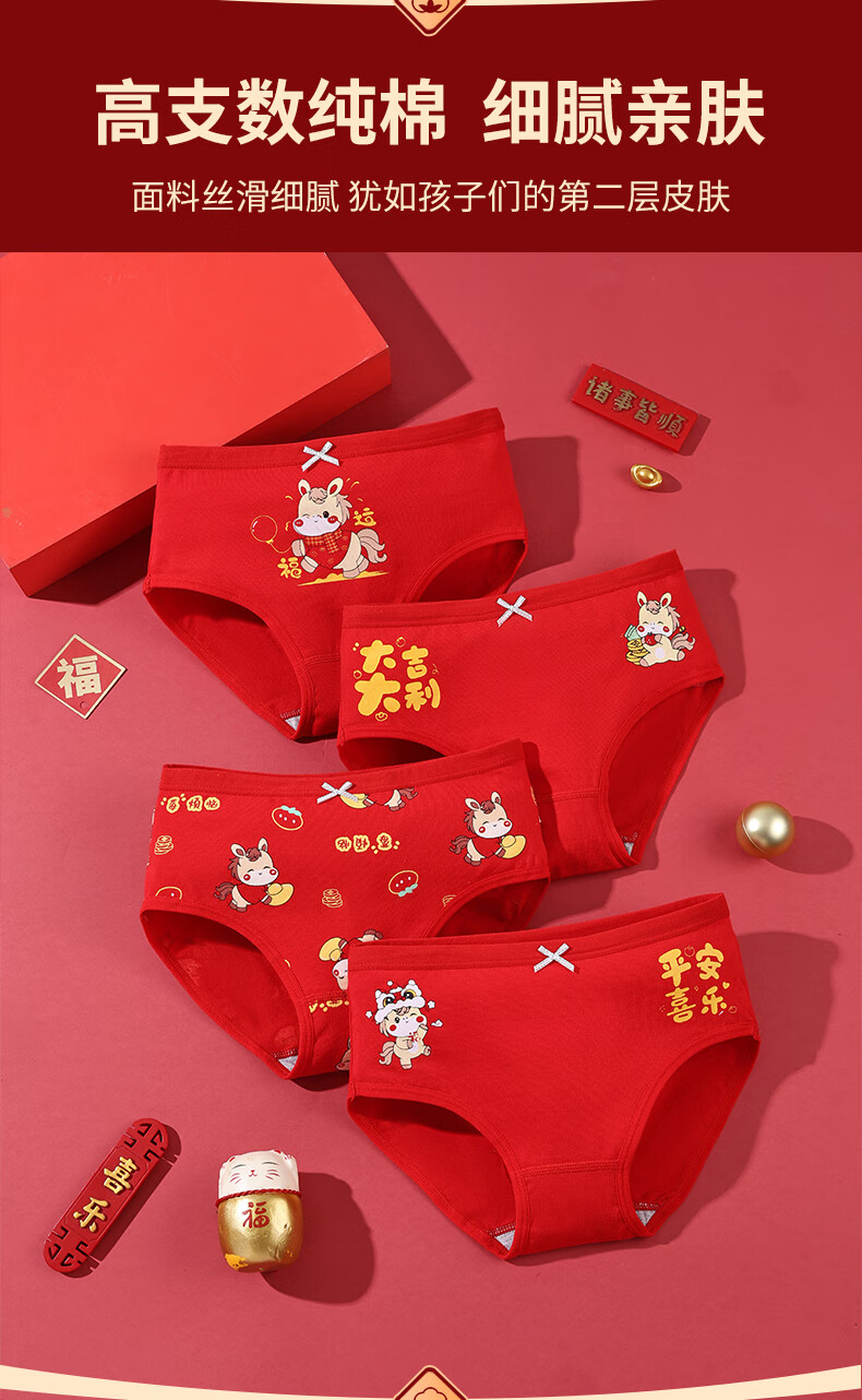 猫人(MiiOW)儿童本命年内裤女童纯棉a类四角女孩马年12岁大红色平角短裤 欢喜小马平角裤 4条 110 推荐高90-105,重20-28斤