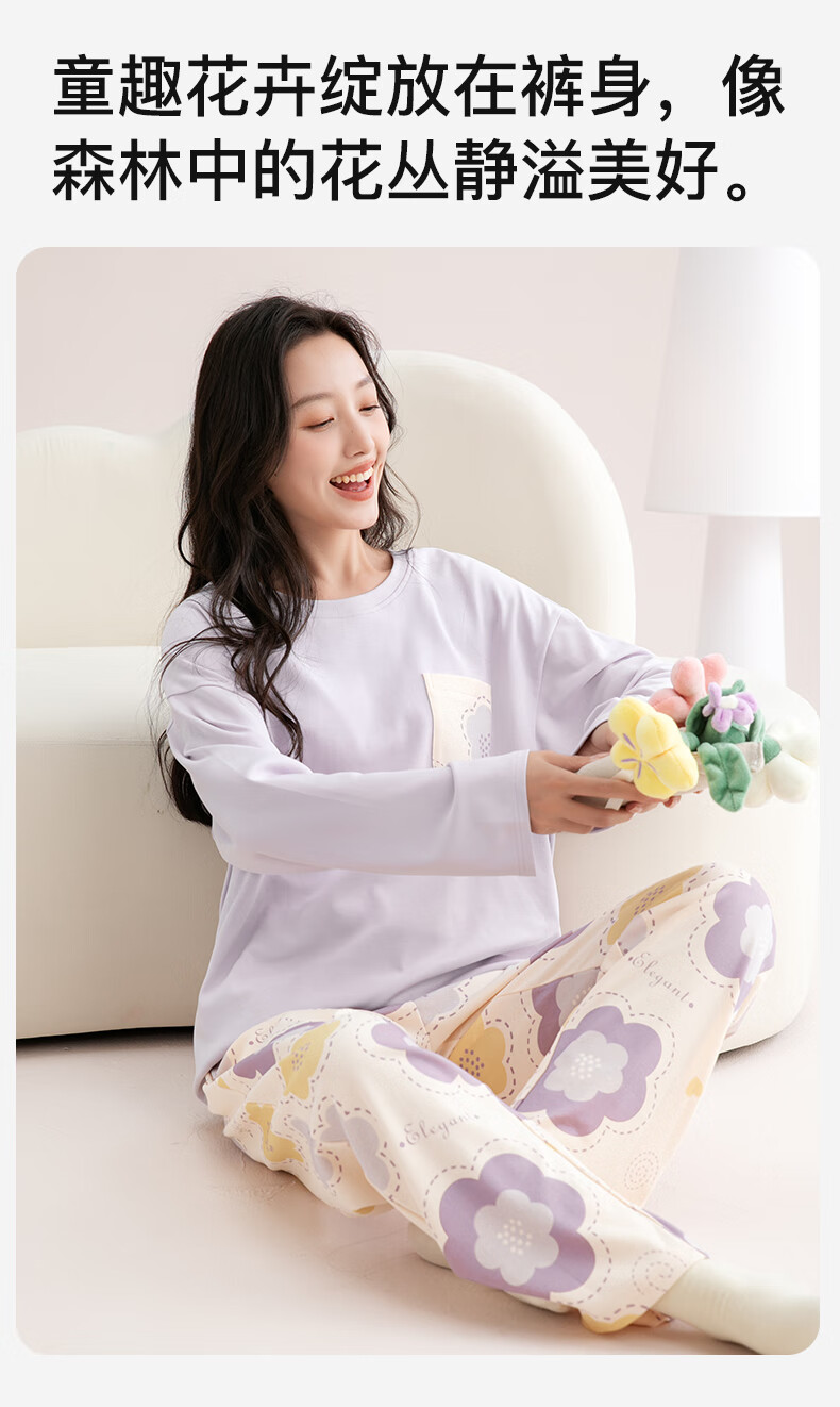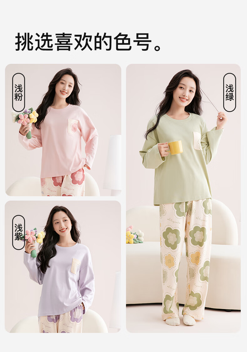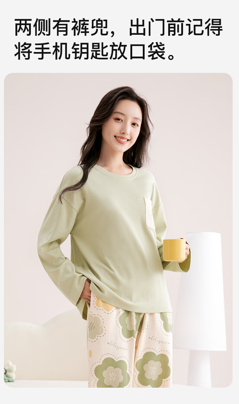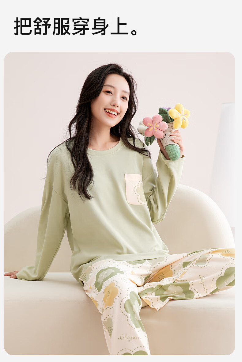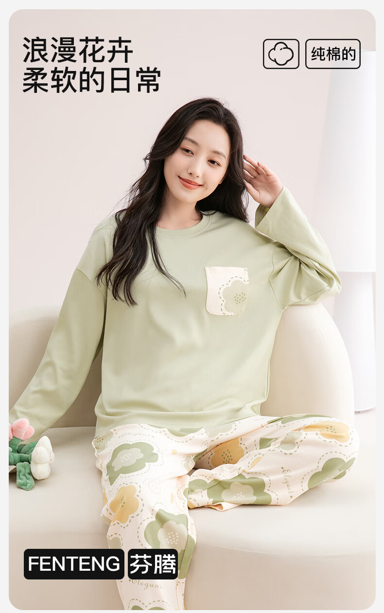 芬腾睡衣女100%纯棉2025秋新款亲肤圆领长袖花卉休闲家居服套装可外穿 浅绿 L