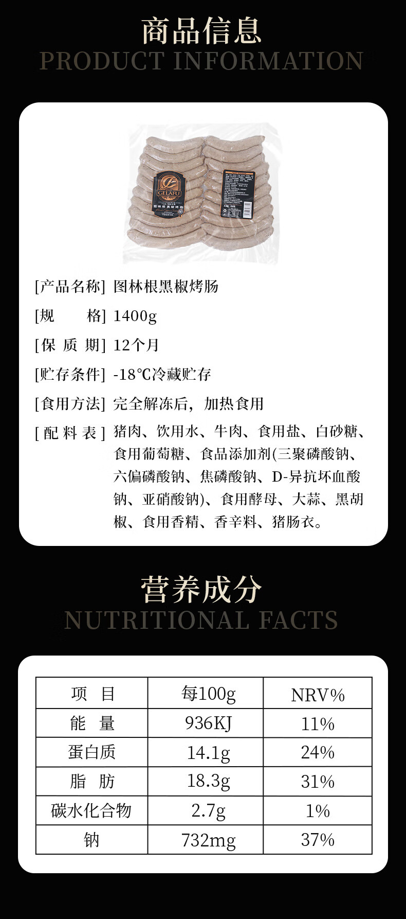 格拉芙图林根黑椒烤肠肉肠火腿 1400g