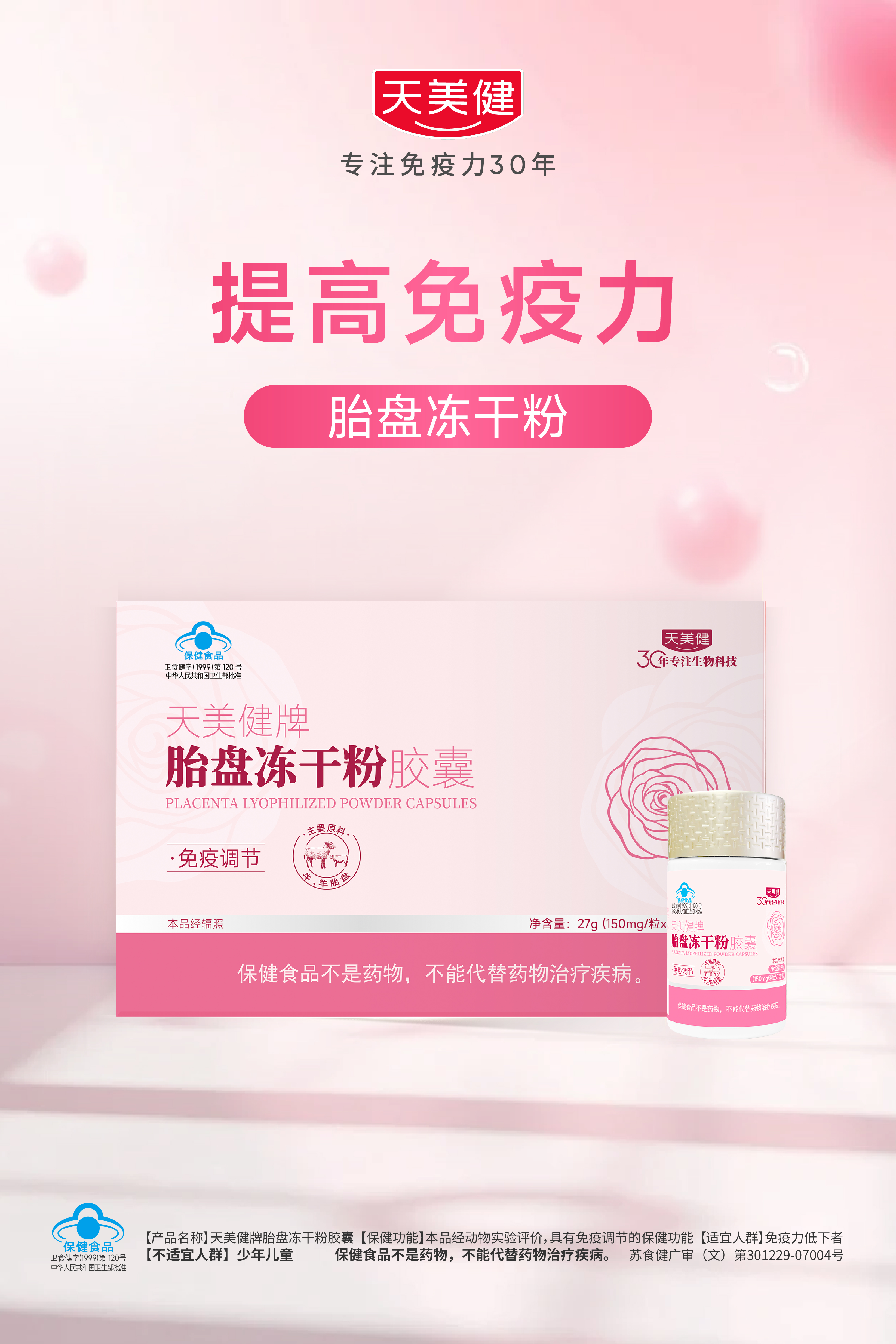 天美健胎盘冻干粉胶囊 科学萃取 滋养内在 免疫调节 27g*1盒 (150mg/粒x60粒/瓶x3瓶)盒