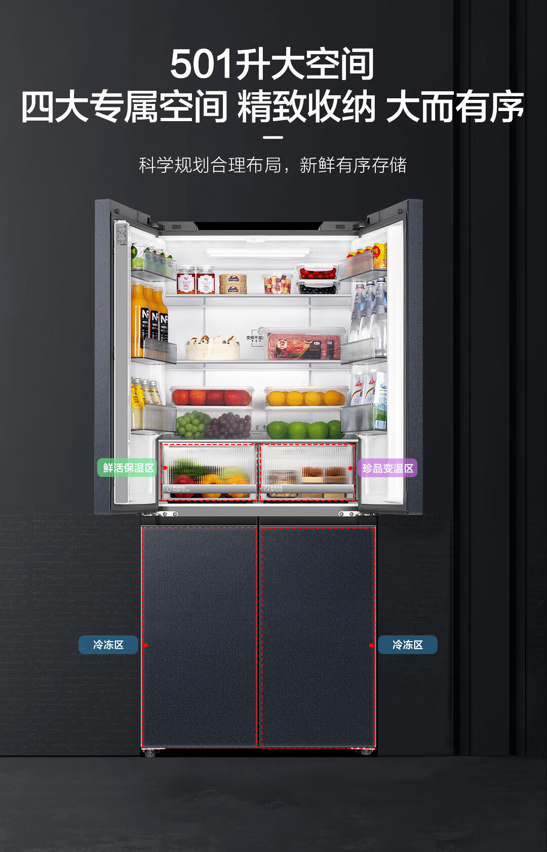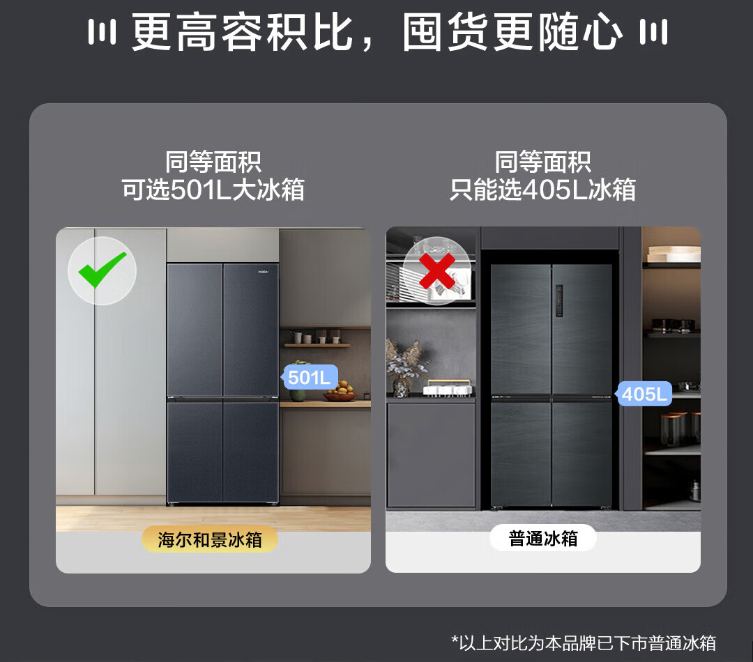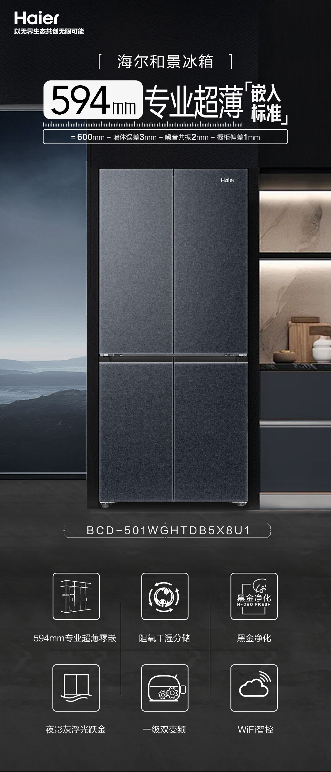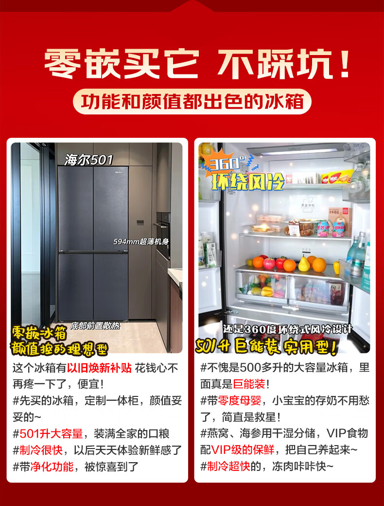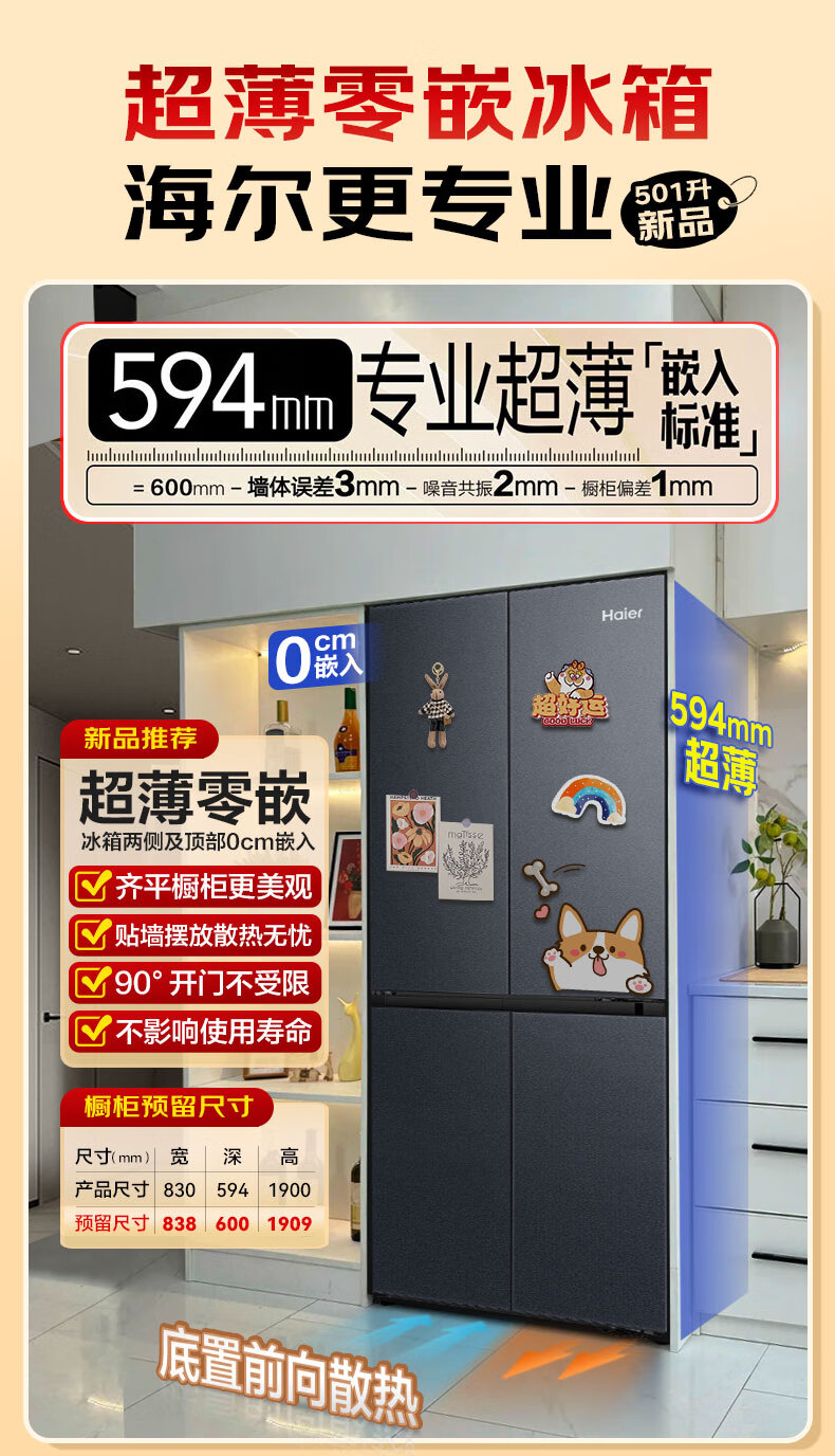 海尔(Haier)冰箱594mm超薄零嵌入式501升冰箱十字门双开门四门一级能效双变频家用干湿分储大容量电冰箱 501大容量+黑金净化+阻氧干湿分储+WiFi智控