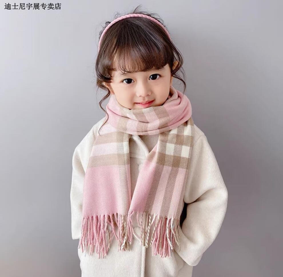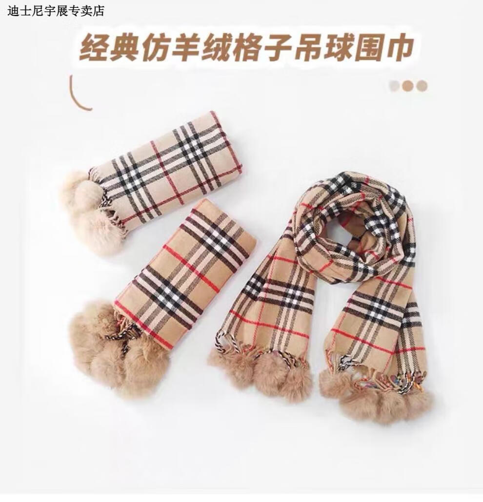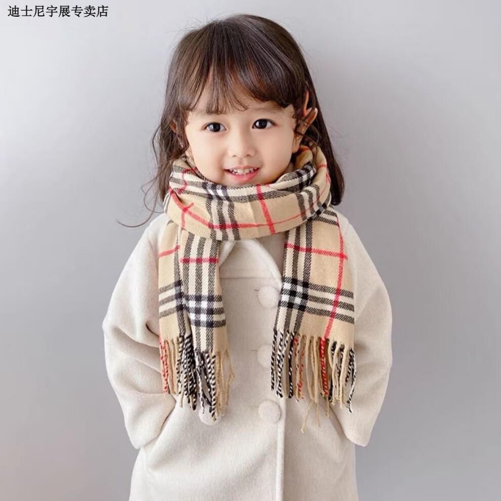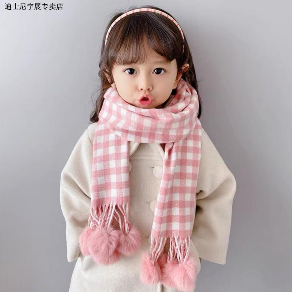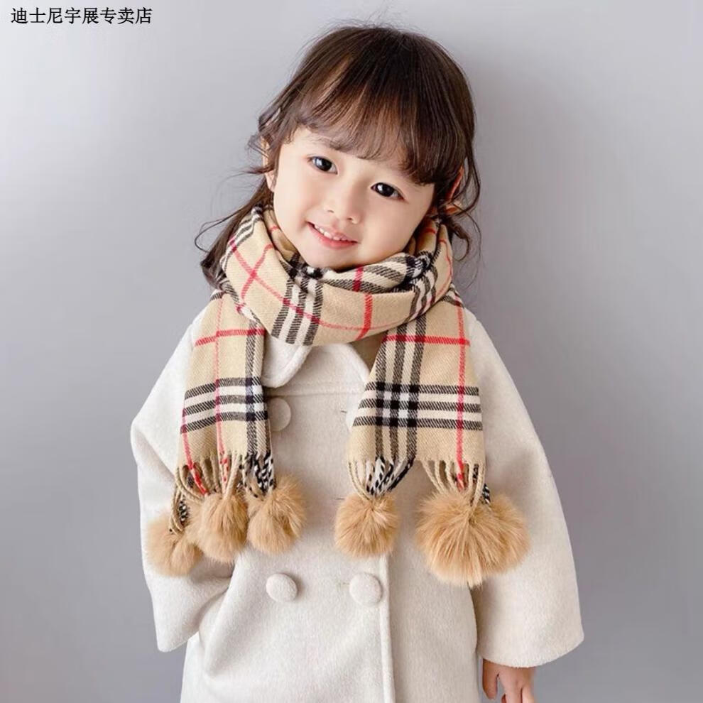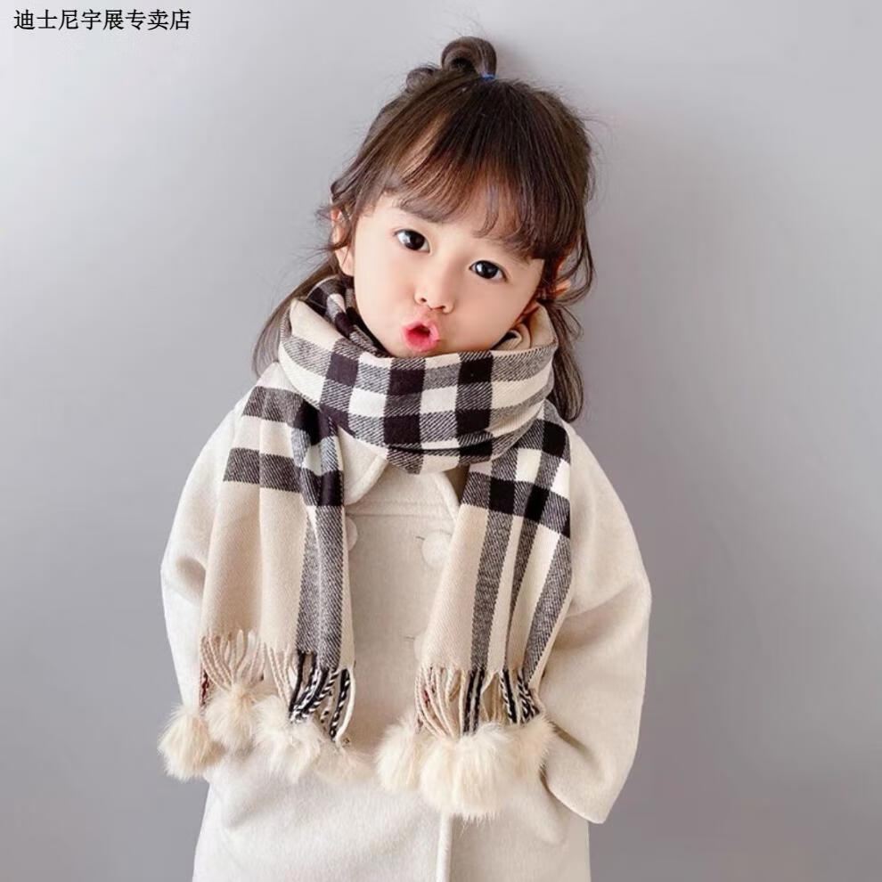 迪士尼(Disney)儿童围巾秋冬加厚保暖围脖格子男女童毛球幼儿围脖冬流苏宝宝围巾 毛球款-驼色细格