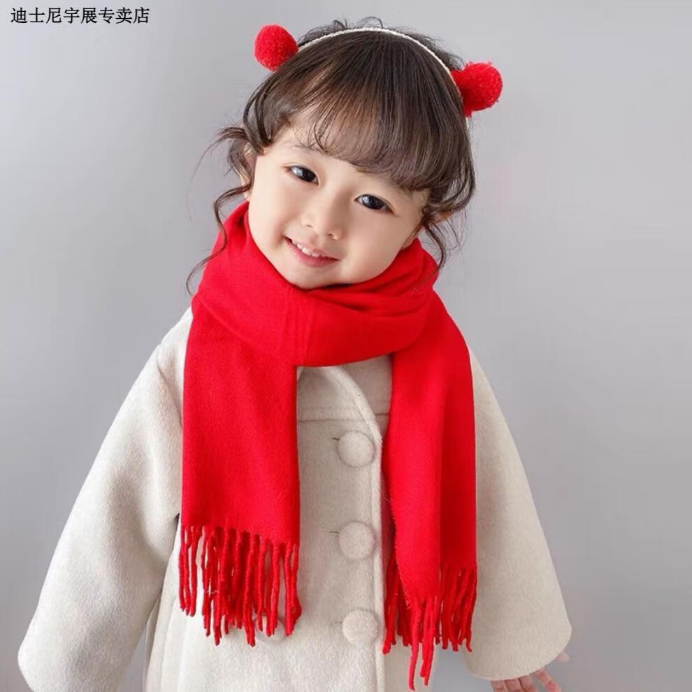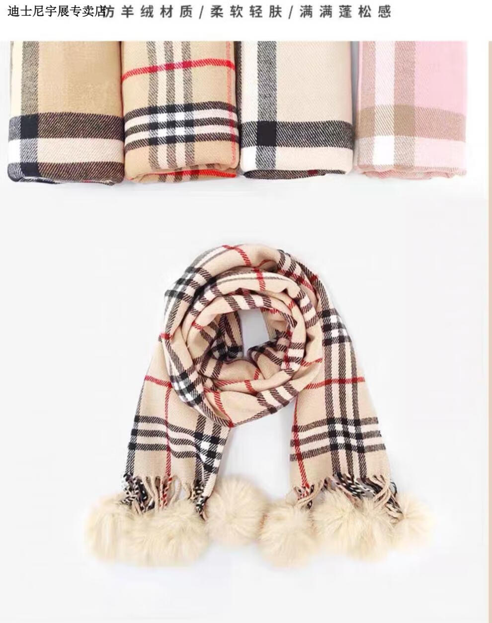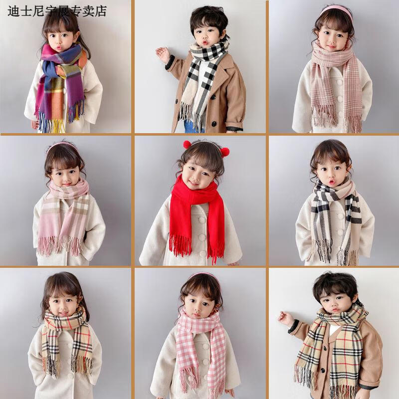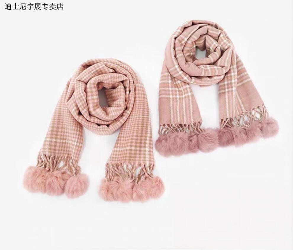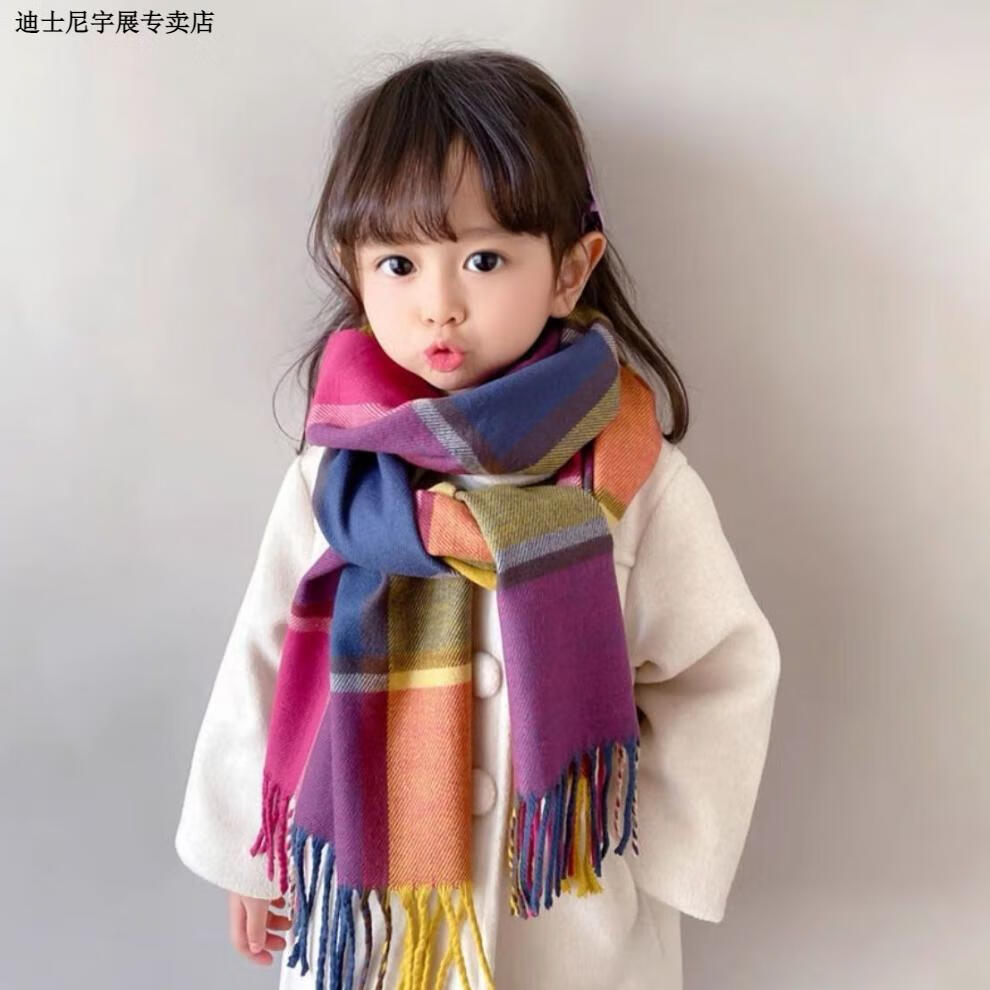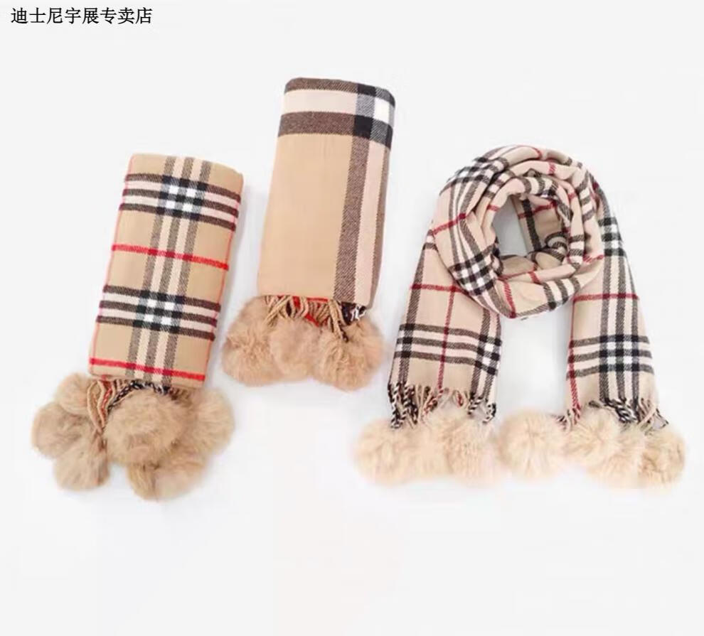 迪士尼(Disney)儿童围巾秋冬加厚保暖围脖格子男女童毛球幼儿围脖冬流苏宝宝围巾 毛球款-驼色细格