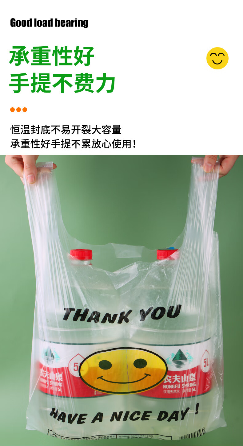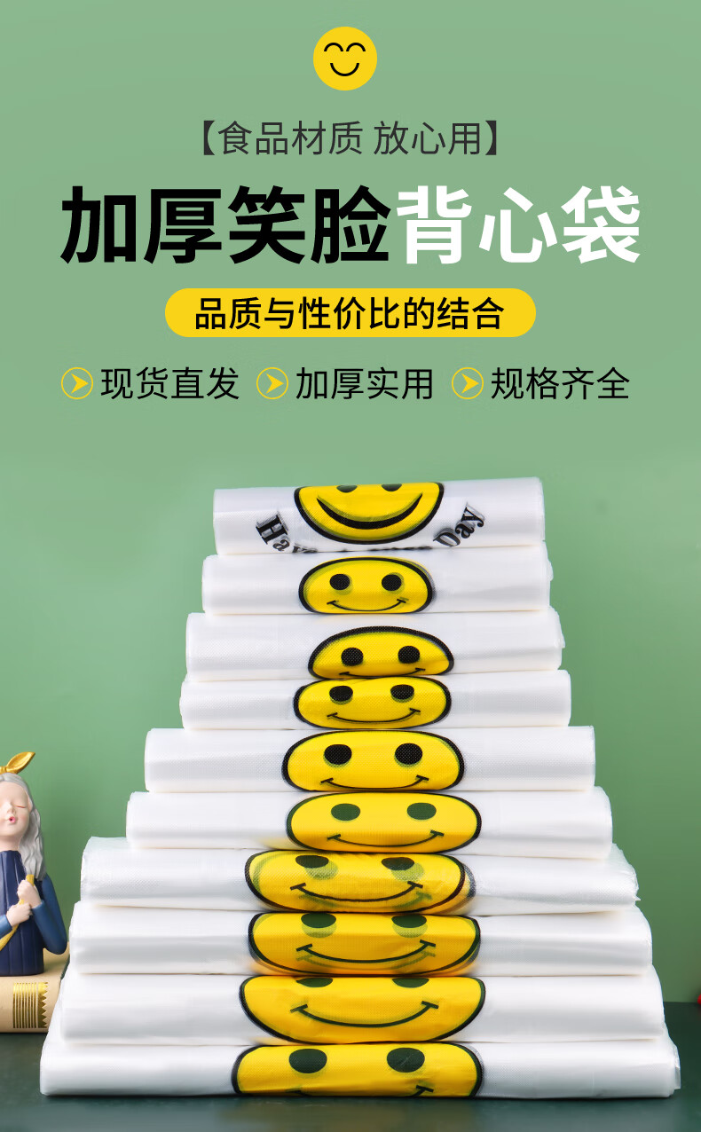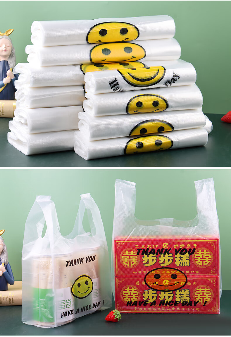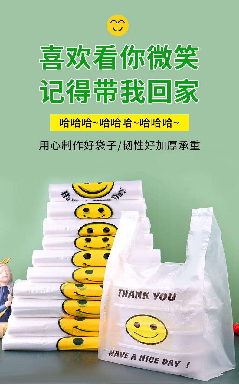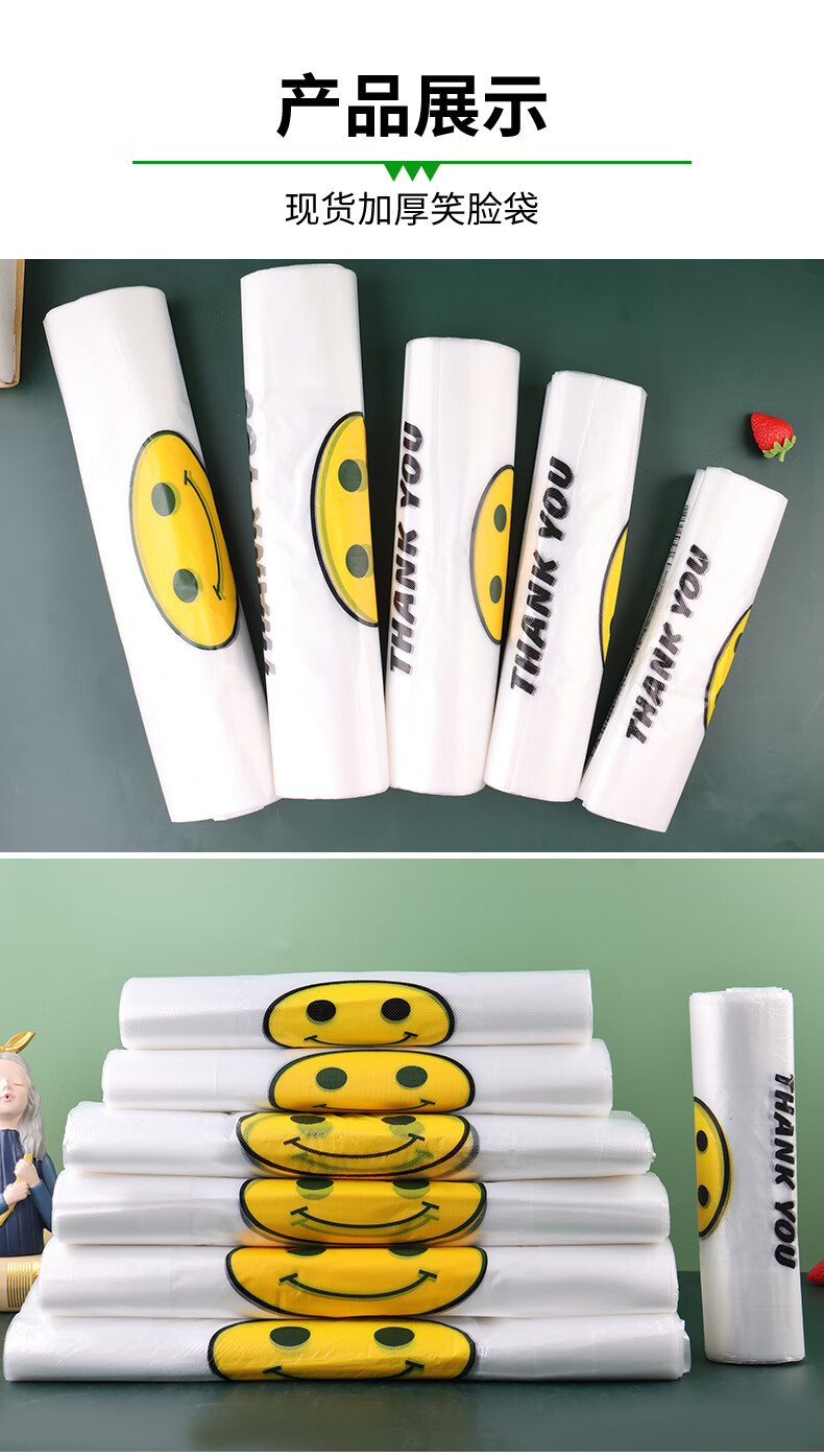笑脸加厚透明塑料袋外卖食品袋商用打包背心购物方便手提袋子批发 20*32*10cm 中厚 笑脸袋 50个