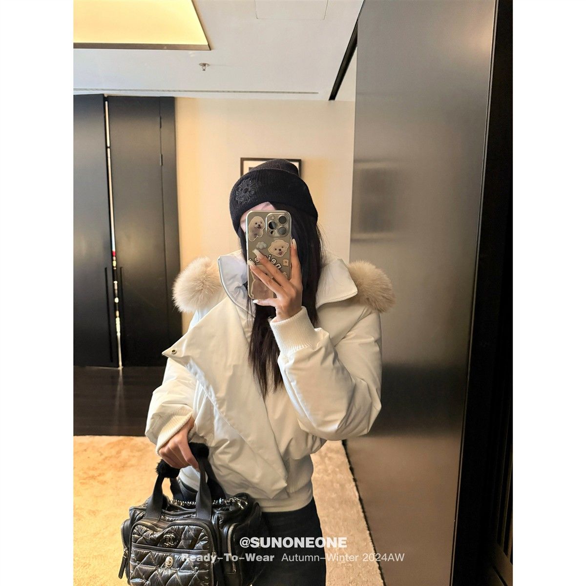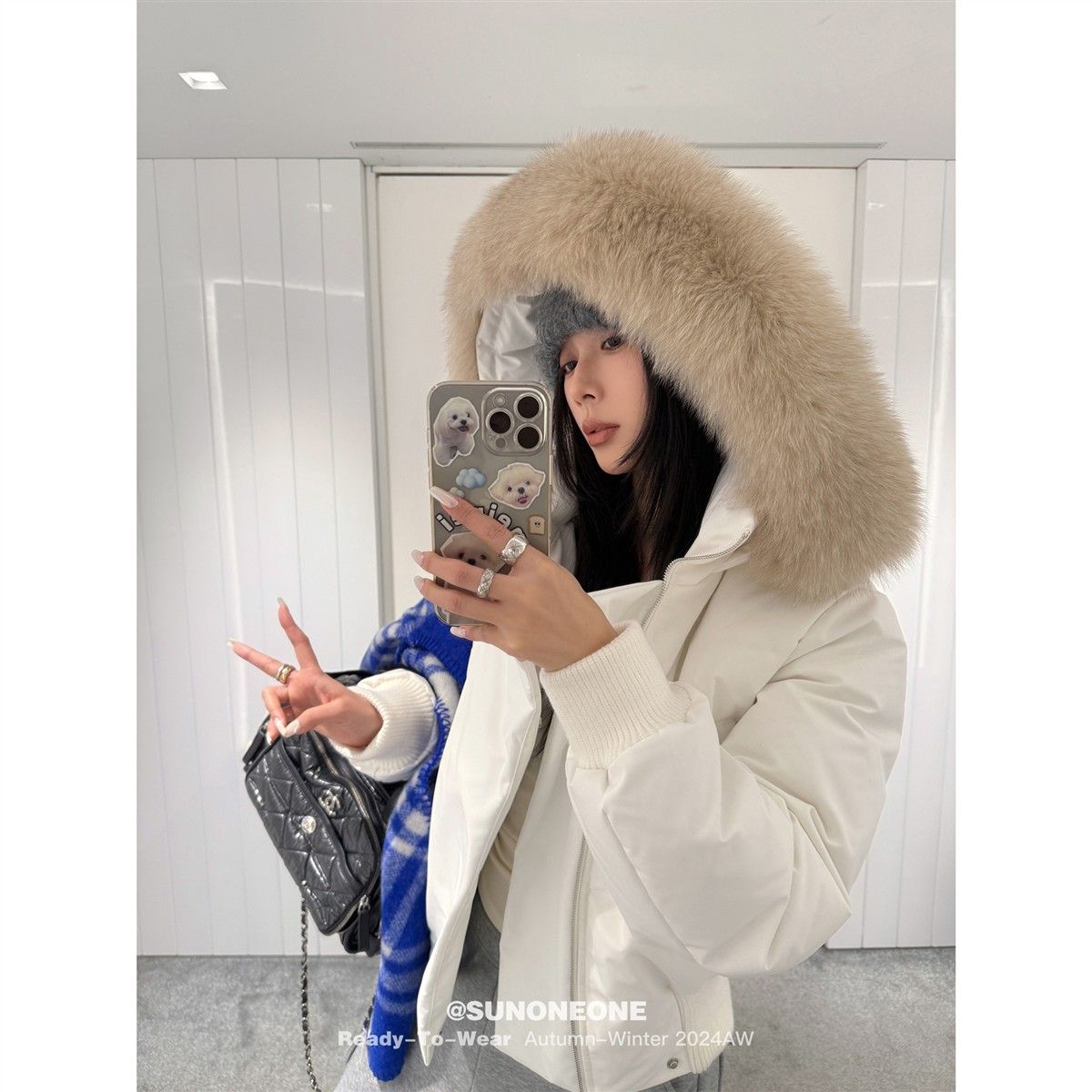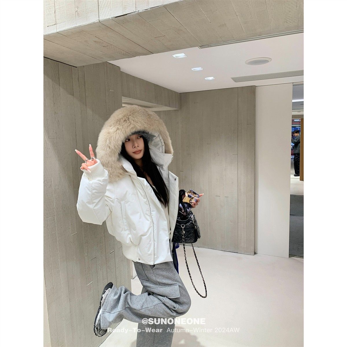 SUNONEONE F仿狐狸毛领ins短款羽绒服女冬90白鸭绒连帽加厚外套