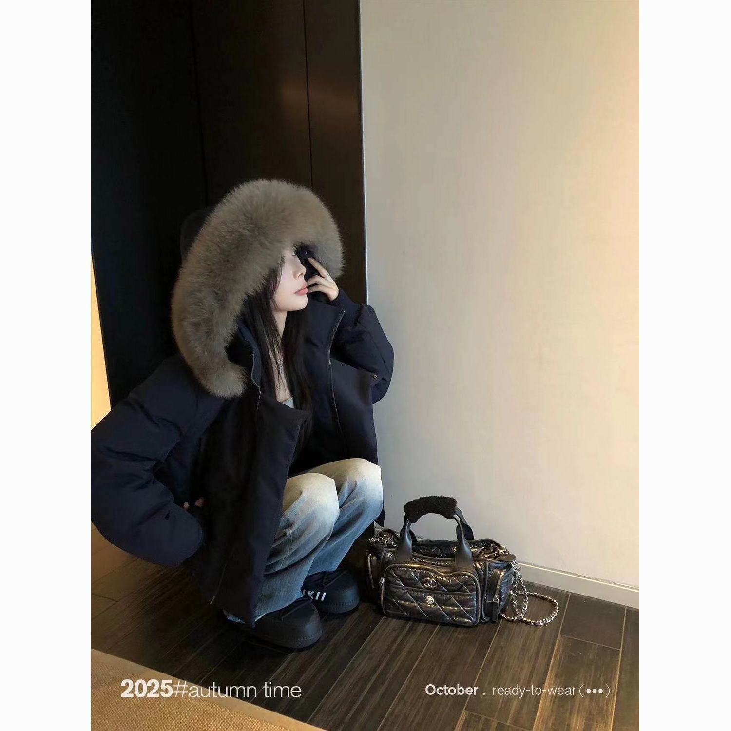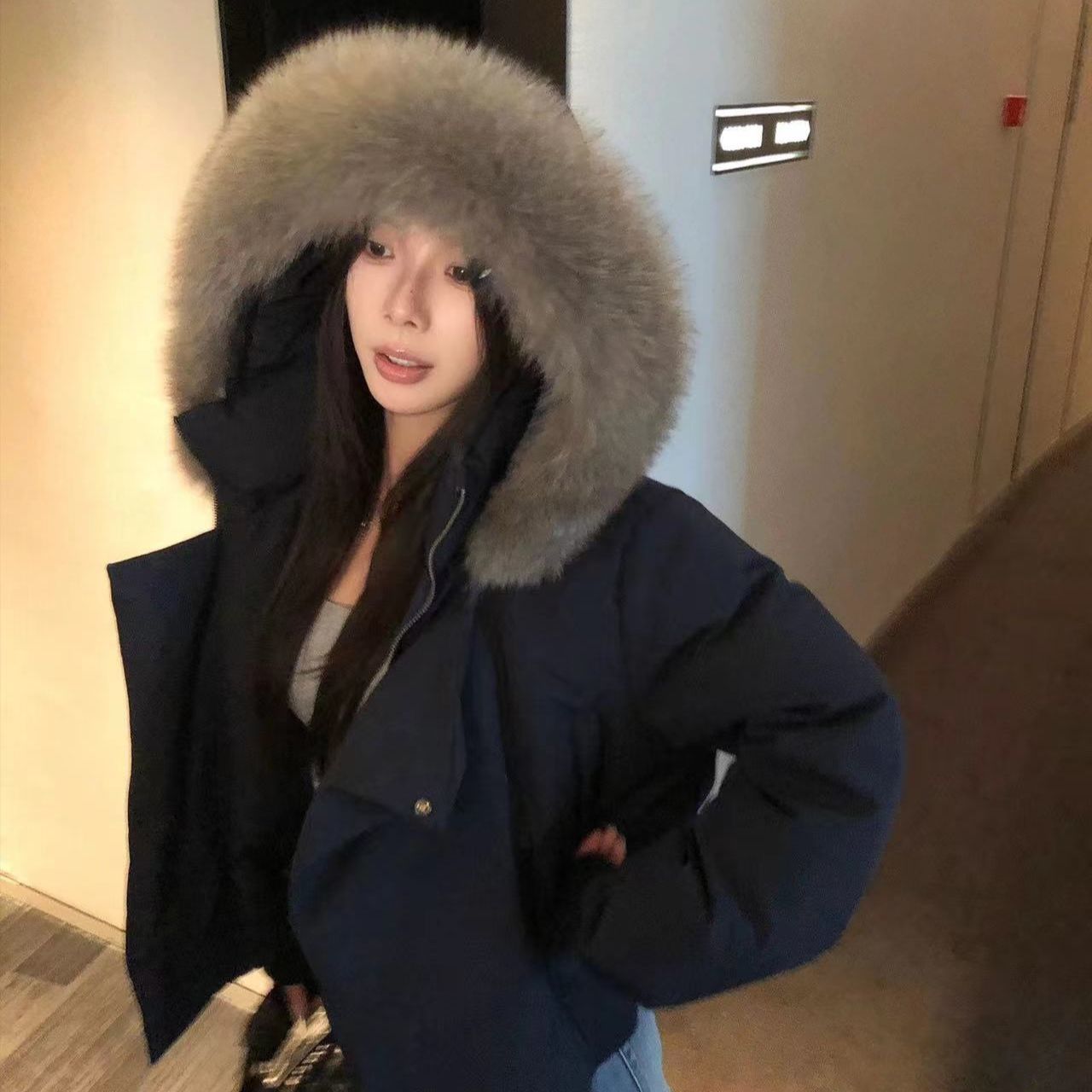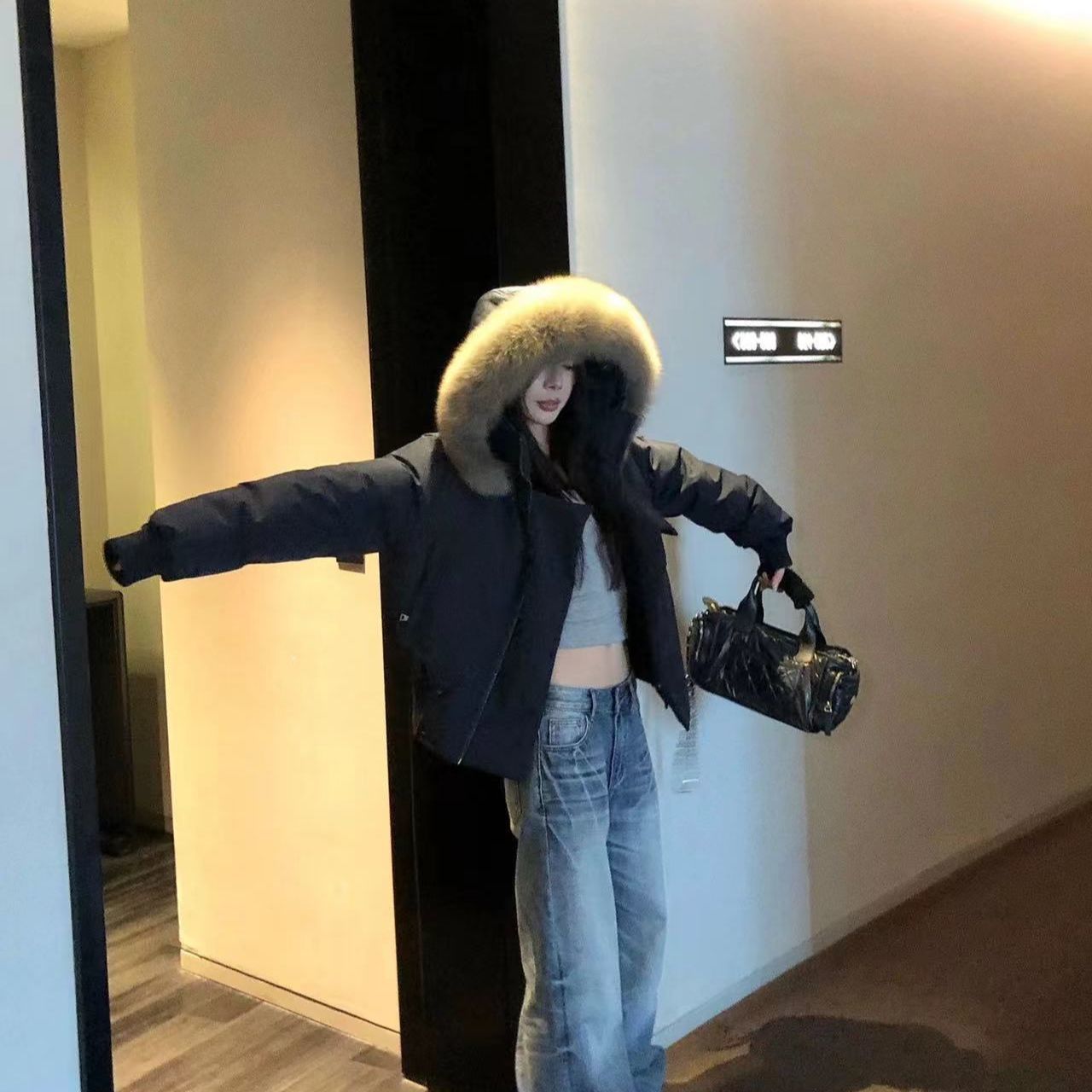 SUNONEONE F仿狐狸毛领ins短款羽绒服女冬90白鸭绒连帽加厚外套