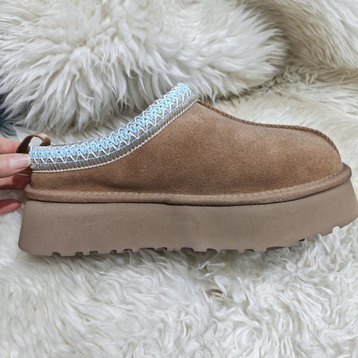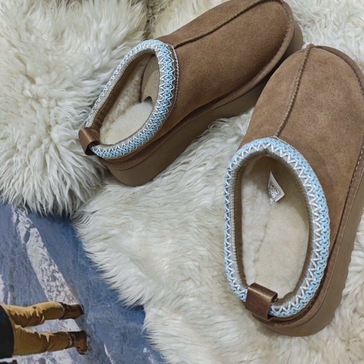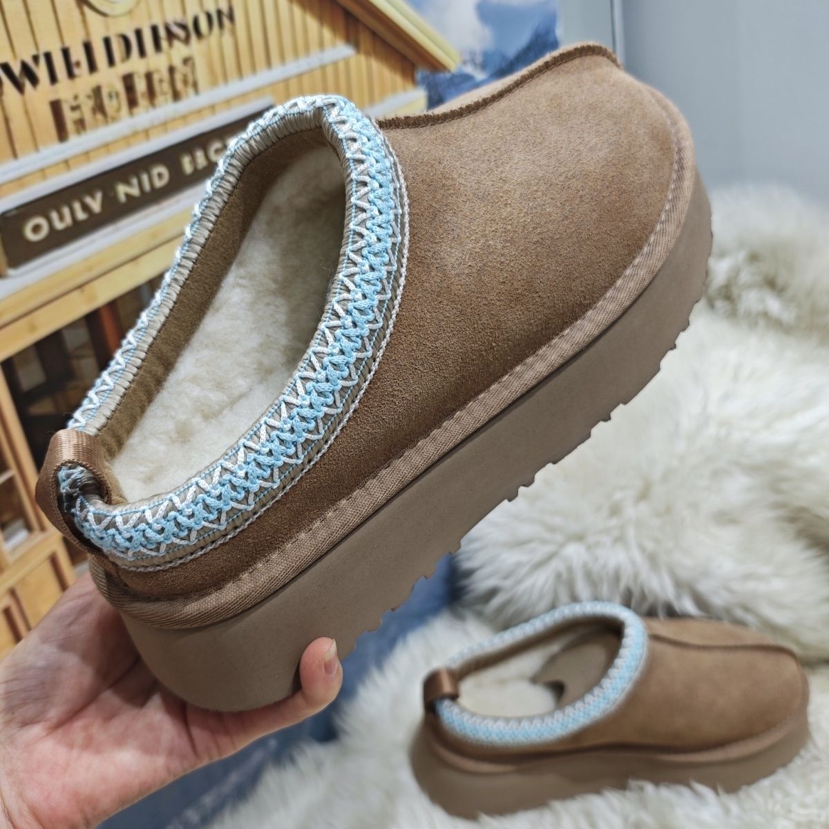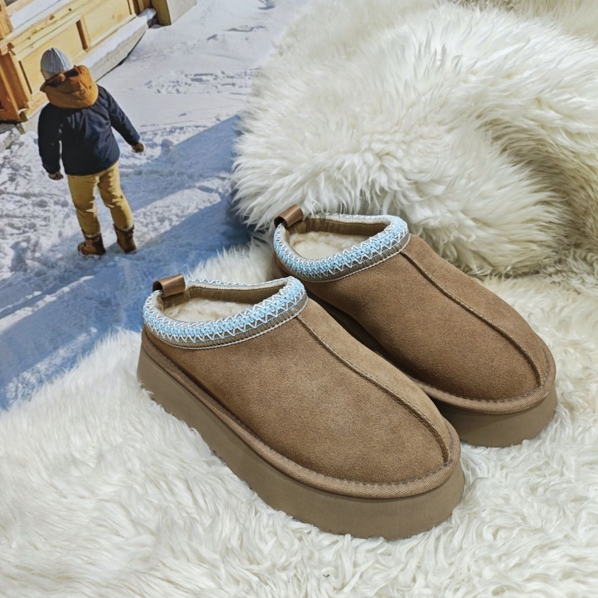 桑坡冬季新款【兰花边民族风】拖鞋保暖加厚包头真皮雪地靴女厚底