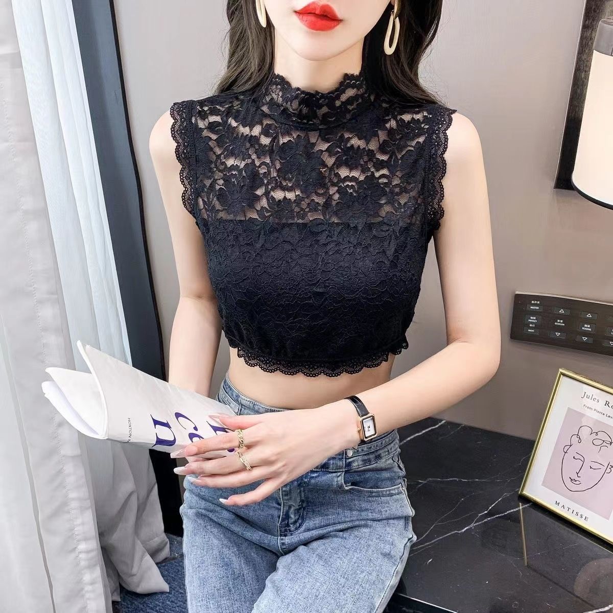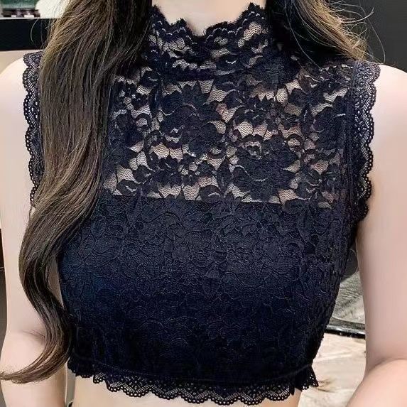 抖音同款秋冬新款大码百搭时尚假领子高弹力蕾丝背心女套头打底衫